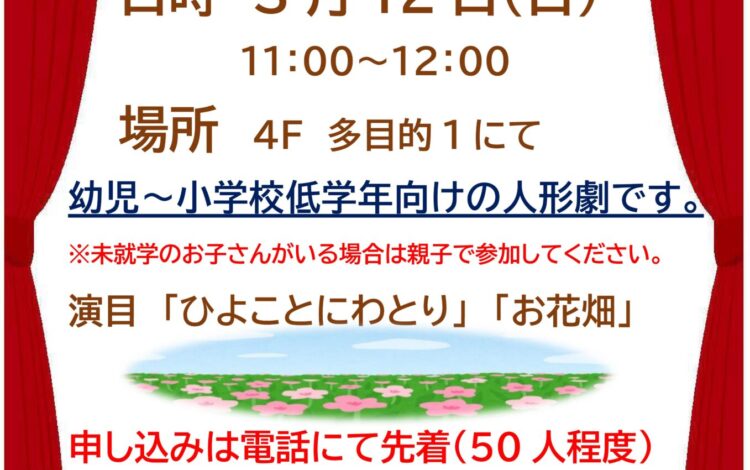 【日時】3月12日(日)11:00~12:00 【会場】こどもプラザ 4階多目的スペース1 【対象】幼児から小学生とその保護者 【演目】「ひよことにわとり」 「お花畑」 【定員】50人程度 【受付】2月25日(土)9:00より こどもプラザ図書館カウンターと電話(5600-3885)にて承ります。 【参加条件】※必ずお読みください 新型コロナウイルス感染予防の取り組みとして、ご参加にあたり下記の条件を ご了承いただくことが必要となります。ご理解・ご協力をお願いいたします。 ①館内、およびイベント参加期間中はマスクを着用 (小さいお子様や健康上の理由でマスクを着用できない方は除く) ②当日は、平熱であることを確認してご参加ください ※都内の新型コロナウイルスの感染状況により急遽中止とさせていただく場合もございます。 あらかじめご了承ください。 【問い合わせ先】こどもプラザ 03-5600-3885 詳しくはこちら