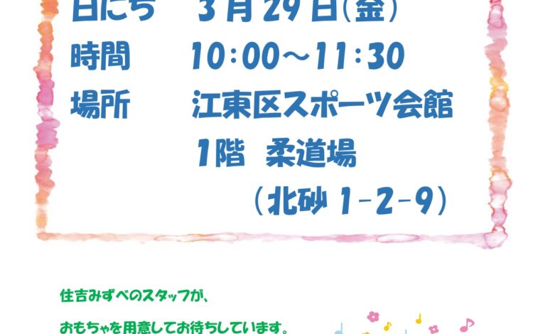 3月29日(金)、江東区スポーツ会館で子育てひろばを開催いたします。 是非みなさん、あそびに来てください。 詳しくはポスターをご覧ください。 くわしくはこちら