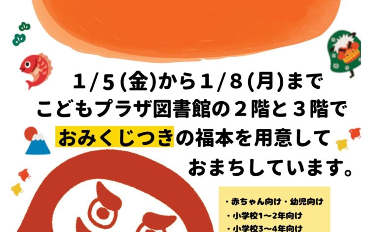 こどもプラザ図書館では1月5日の新年の開館日より、カバーをかけたおすすめ本《福本》の貸し出しを行います。 内容は赤ちゃん向けからYA世代向けまで、対象別に幅広くご用意いたします。 《福本》には、こどもプラザ図書館特製のおみくじも入っていますよ♪ ワクワクがいっぱいの福本で、新年の読書始めをしましょう! 新しい1年も、こどもプラザ図書館をよろしくお願いいたします。 【期間】1月5日(金)~1月8日(月・祝) ◇2階 カウンター前 『赤ちゃん向け』『幼児向け』『小学校1~2年向け』の3種の福本をご用意しています。 ◇3階 カウンター前 『小学校3~4年向け』『小学校5~6年向け』『YA向け』の3種の福本をご用意しています。 内容:図書館スタッフが選んだ、みんなにお勧めしたい本です。 ※福本は数量限定です。なくなり次第終了いたします。 ※貸出資料です。プレゼントではありませんのでご注意ください。 ※福本は自動貸出機では貸出できません。お手数ですがカウンターまでお持ちください。 【問い合わせ先】こどもプラザ図書館 03-5600-3885 詳しくはこちら
