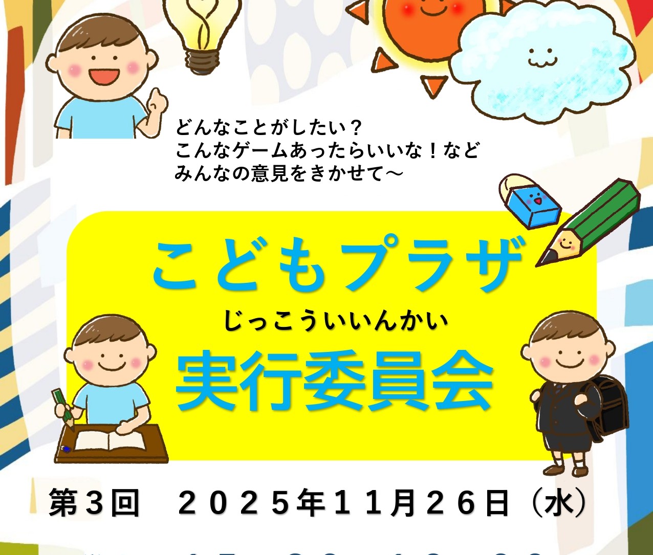 第3回 こどもプラザ実行委員会 2025年11月26日( 水 ) 小学生15:30~16:00 中高生17:00~17:30 どんなことがしたい? こんなゲームあったらいいな!など みんなの意見をきかせて下さい。 参加してくれるおともだちは、 当日4階会議室に来て下さい。
