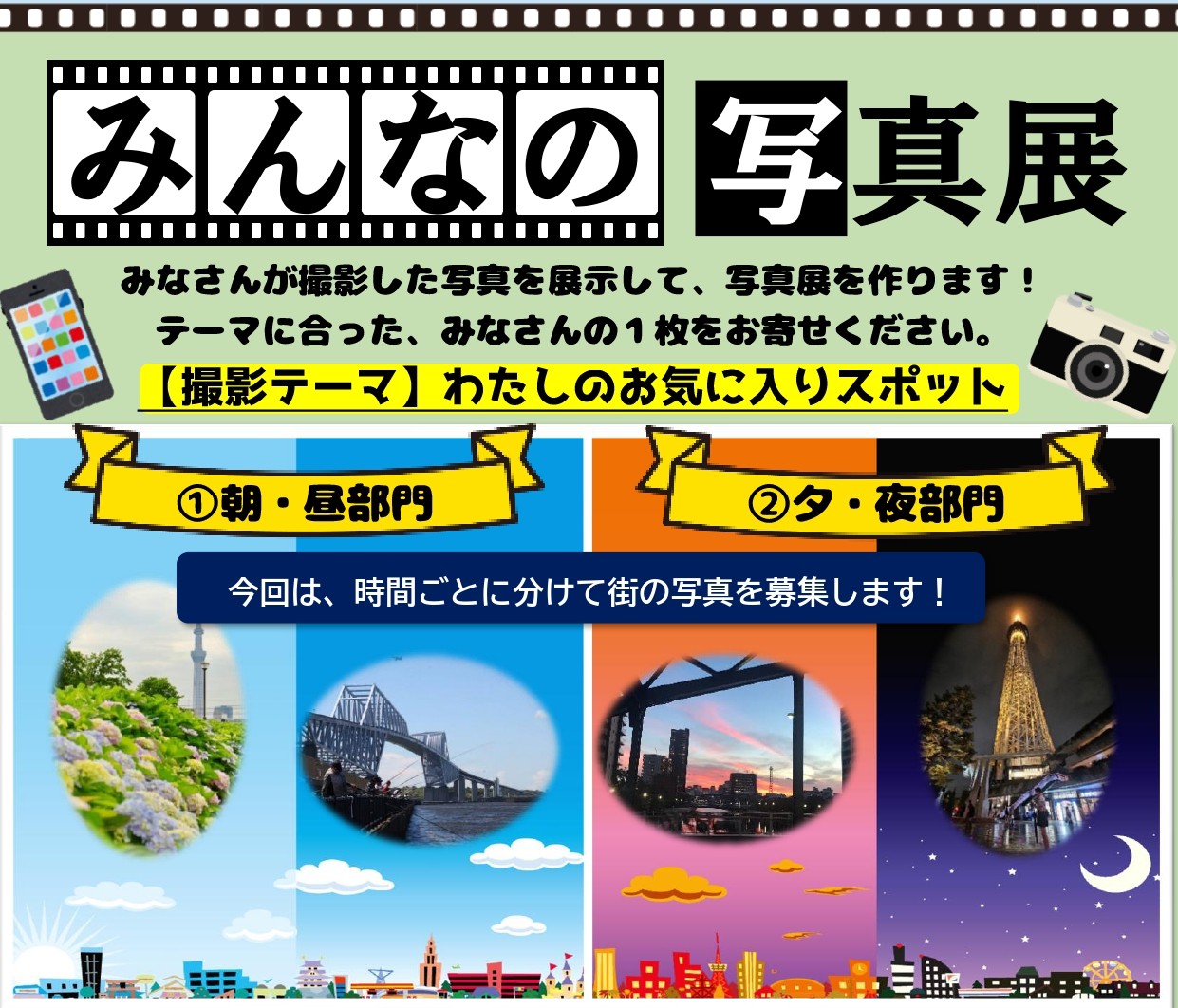 みなさんが撮影した写真を展示して、写真展を作ります! テーマに合った、みなさんの1枚をお寄せください。 【撮影テーマ】わたしのお気に入りスポット ①朝・昼部門 ②夕・夜部門 今回は、時間ごとに分けて街の写真を募集します! ☆今回の写真展では受賞作品を決めます。入賞者には賞品も用意しています! 【投稿受付期間】10月11日(土)~11月16日(日) 応募写真投稿フォーム 【写真展示期間】12月1日(月)~12月21日(日) 【展示会場】江東区こどもプラザ1階