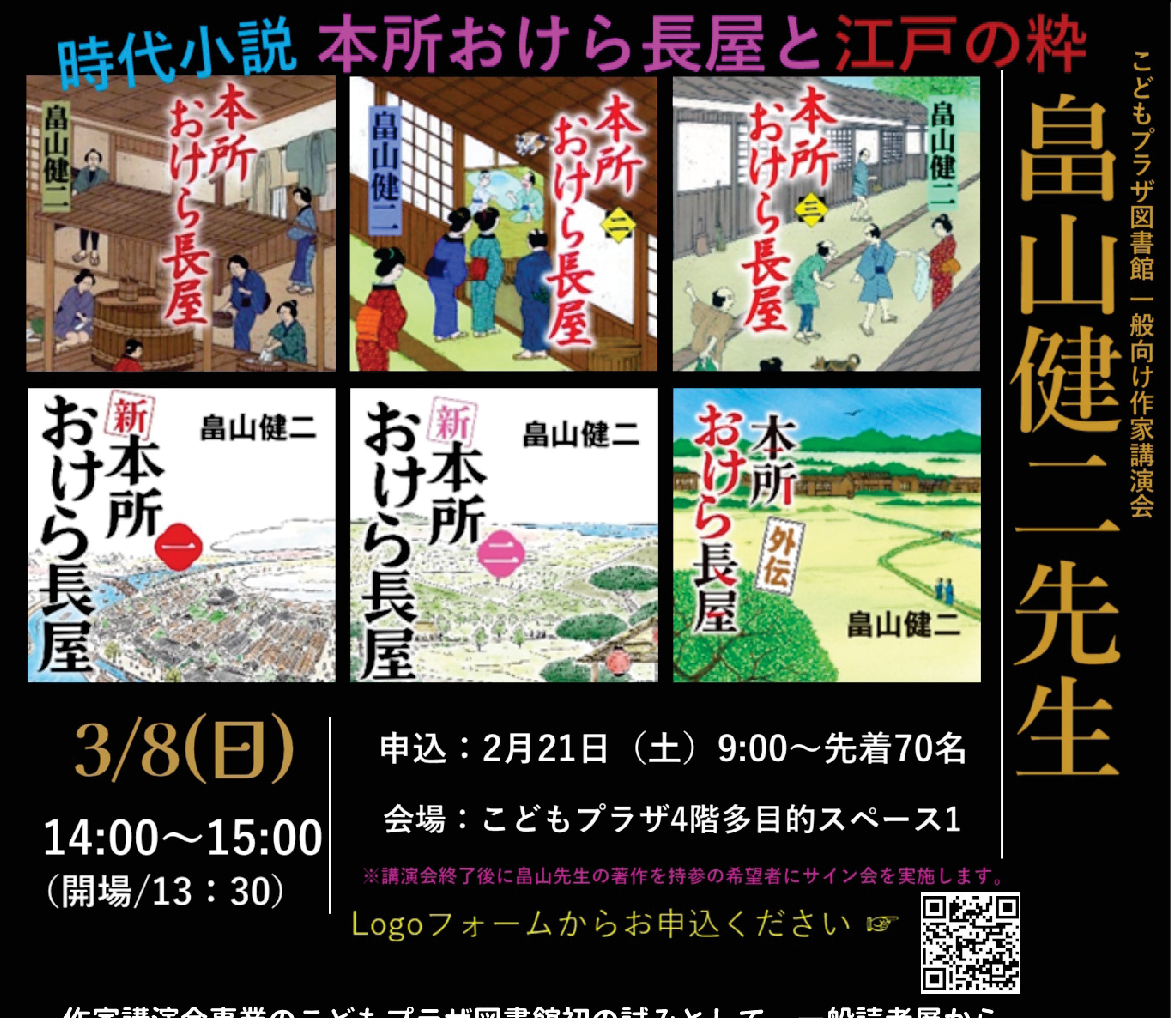 こどもプラザ図書館初の試みとして、一般の読者層から「本所おけら長屋」シリーズなどが高い人気の時代小説作家・畠山健二先生をお招きして、講演会を開催します。