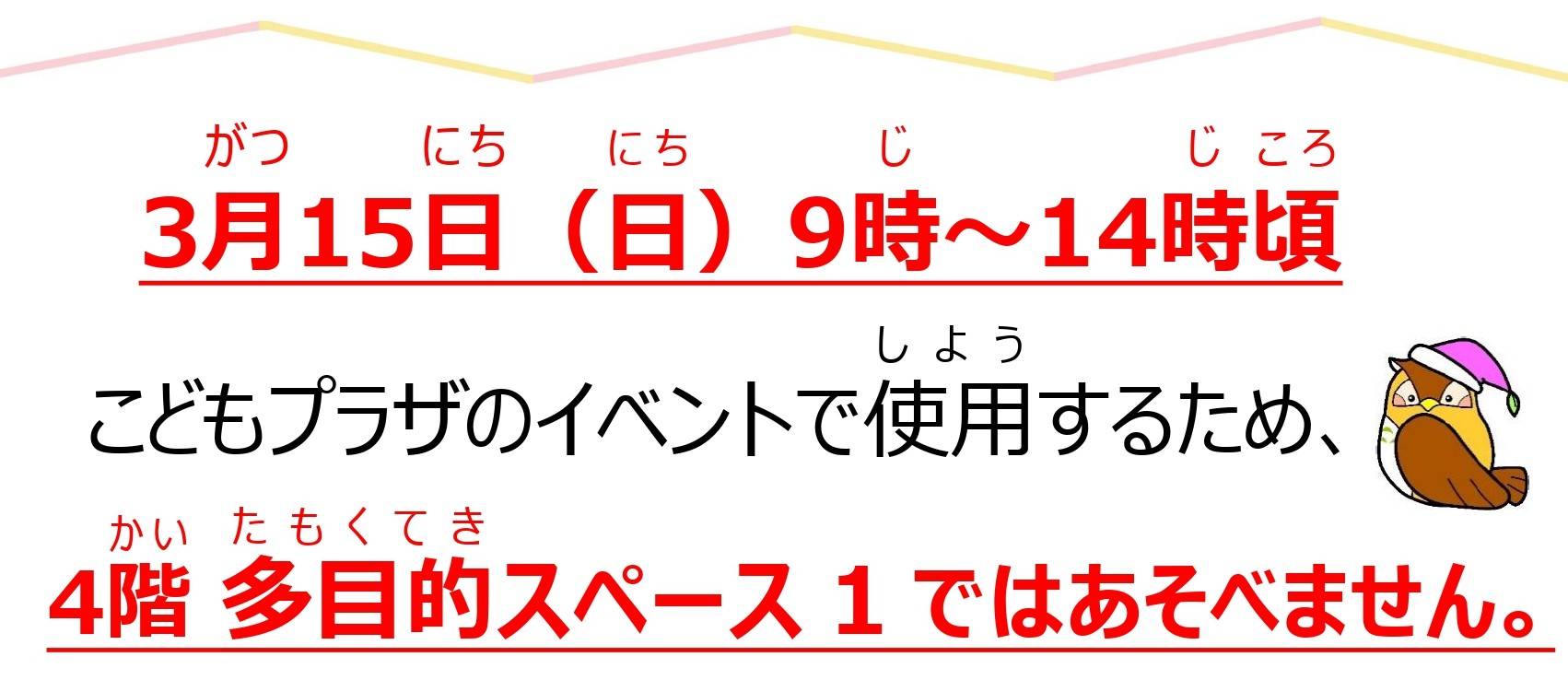 2026.03.01 こどもプラザ 3/15(日)多目的スペース1の利用について いつも、こどもプラザをご利用いただきありがとうございます。 3/15(日)9時~12時頃まで、プラザのイベントで使用するため 多目的スペース1は使用できません。 その時間帯は、他の場所で遊んでください。よろしくお願いいたします。 詳しくはこちら 前の記事へ 一覧へ戻る
