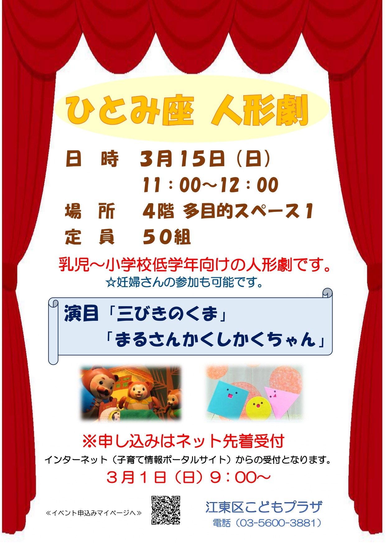 2026.02.22 こどもプラザ 「ひとみ座人形劇」開催のお知らせ 人形劇団ひとみ座さんが今年度も来てくれます! 乳児~小学校低学年向けの演目となります。 日時 3月15日(日)11:00~12:00 場所 こどもプラザ 4階 多目的スペース1 定員 50組(先着順) 申し込み 3/1(日)9:00~ ポータルサイトからの申し込みとなります 申し込みはこちら 問い合わせ先 江東区こどもプラザ 03-5600-3880 詳しくはこちら 次の記事へ 一覧へ戻る