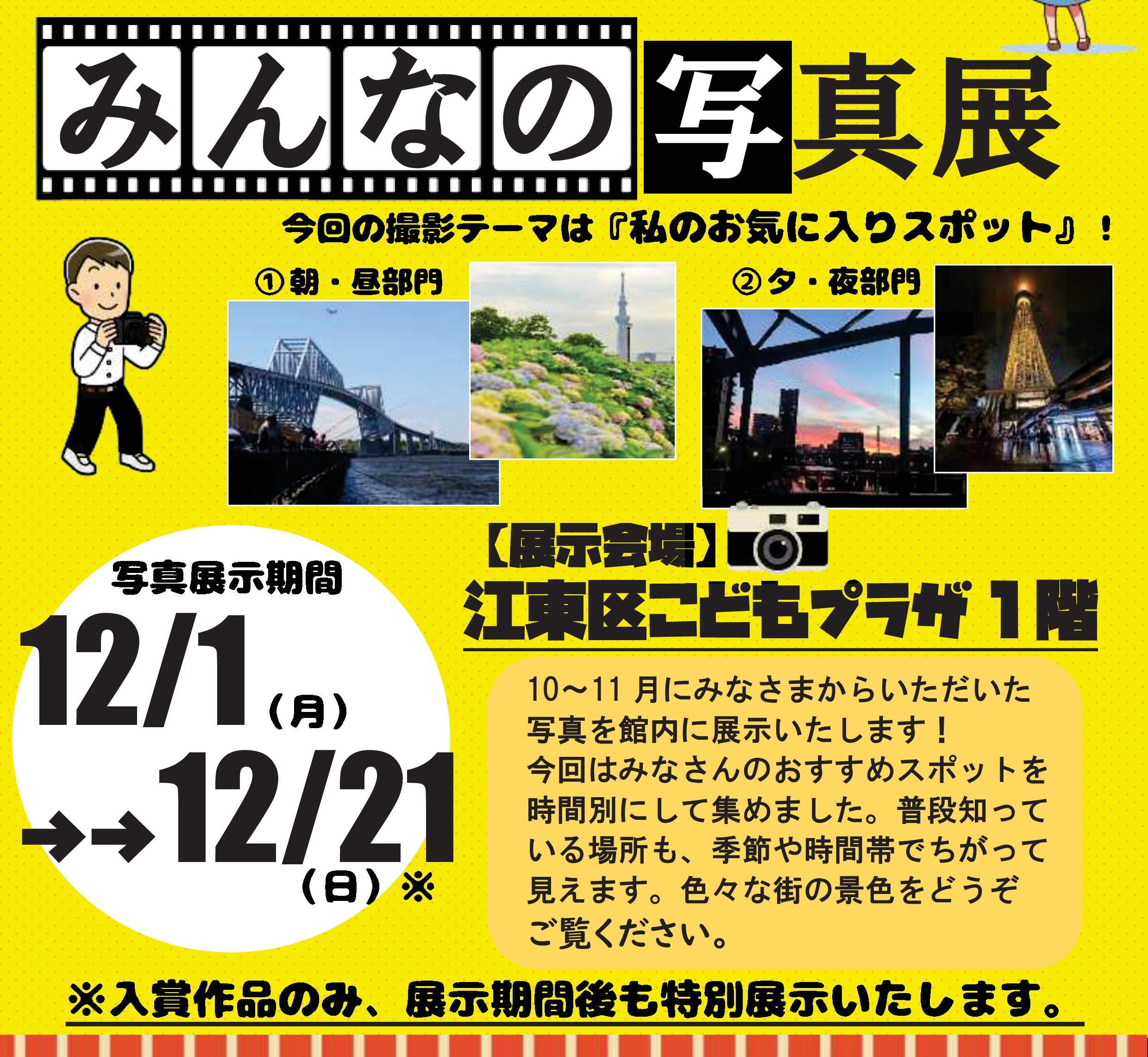 今回はみなさんのおすすめスポットを時間別にして集めた写真展の開催です。 普段知っている場所も、季節や時間帯で違って見えます。色々な街の景色をどうぞご覧ください。 また、特別展示コーナーでは「こどもプラザ周辺の今とむかし」と題して、過去と現在の写真を展示します。 写真を比べて見ることで、道や街の風景の変化がよくわかります。 テーマ:わたしのお気に入りスポット 写真展示期間:12月1日(月)~12月21日(日) ※入賞作品のみ、展示期間後も特別展示いたします。 展示会場:江東区こどもプラザ1階 協力:青少年対策小松橋地区委員会(古写真提供) 問い合わせ先:江東区こどもプラザ 03-5600-3880