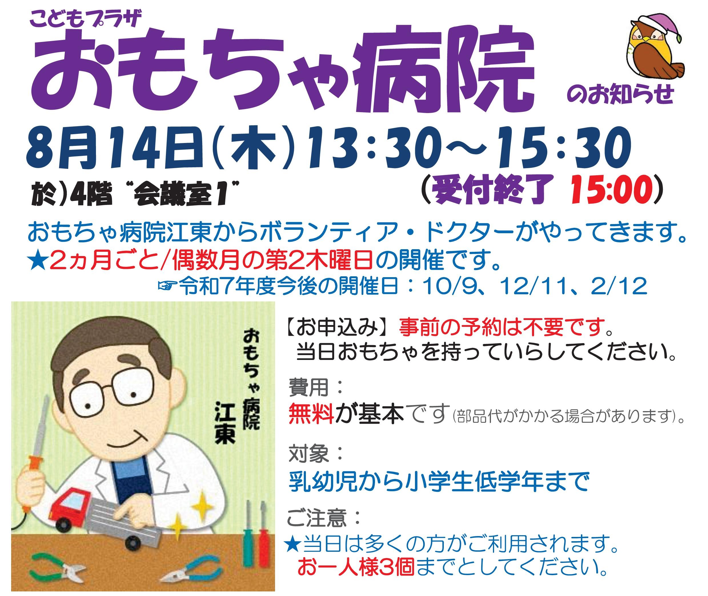 おうちに、動かなくなったり故障してしまったお気に入りのおもちゃはありませんか? おもちゃ箱の中で眠っている宝物を、おもちゃ病院のドクターによみがえらせてもらいましょう。 【日時】 8月14日(木曜日)13時半から15時半(受付終了 15時) 【会場】 江東区こどもプラザ 4階 会議室1 【対象】 乳幼児から小学校低学年 【申込】 事前の予約は不要です。直接会場へお越しください。 【費用】基本は無料ですが、部品代がかかる場合があります。 【注意】★当日は多くの方がご利用されます。お一人様3個 までとしてください。 その場で治療(修理)が基本ですが、入院(持ち帰って修理)となる場合があります。 その場合は後日、こどもプラザ3階事務室で退院(お受け取り)となります。 【以下のおもちゃは治療(修理)できません】 メーカー保証期間中の品(手を加えると保証が失効します) 安全性に問題があるもの(球を発射する鉄砲、ドローン、ヘリコプターなど) 希少価値のあるアンティークな人形やおもちゃ類(手を加えると市場価値が下がります) ディスプレイを備えたゲーム機 直接AC電源に接続するおもちゃ 浮き輪・ベビープール 充電池の交換・充電回路の修理 ※転売目的や業者の方のご依頼はお断りいたします。