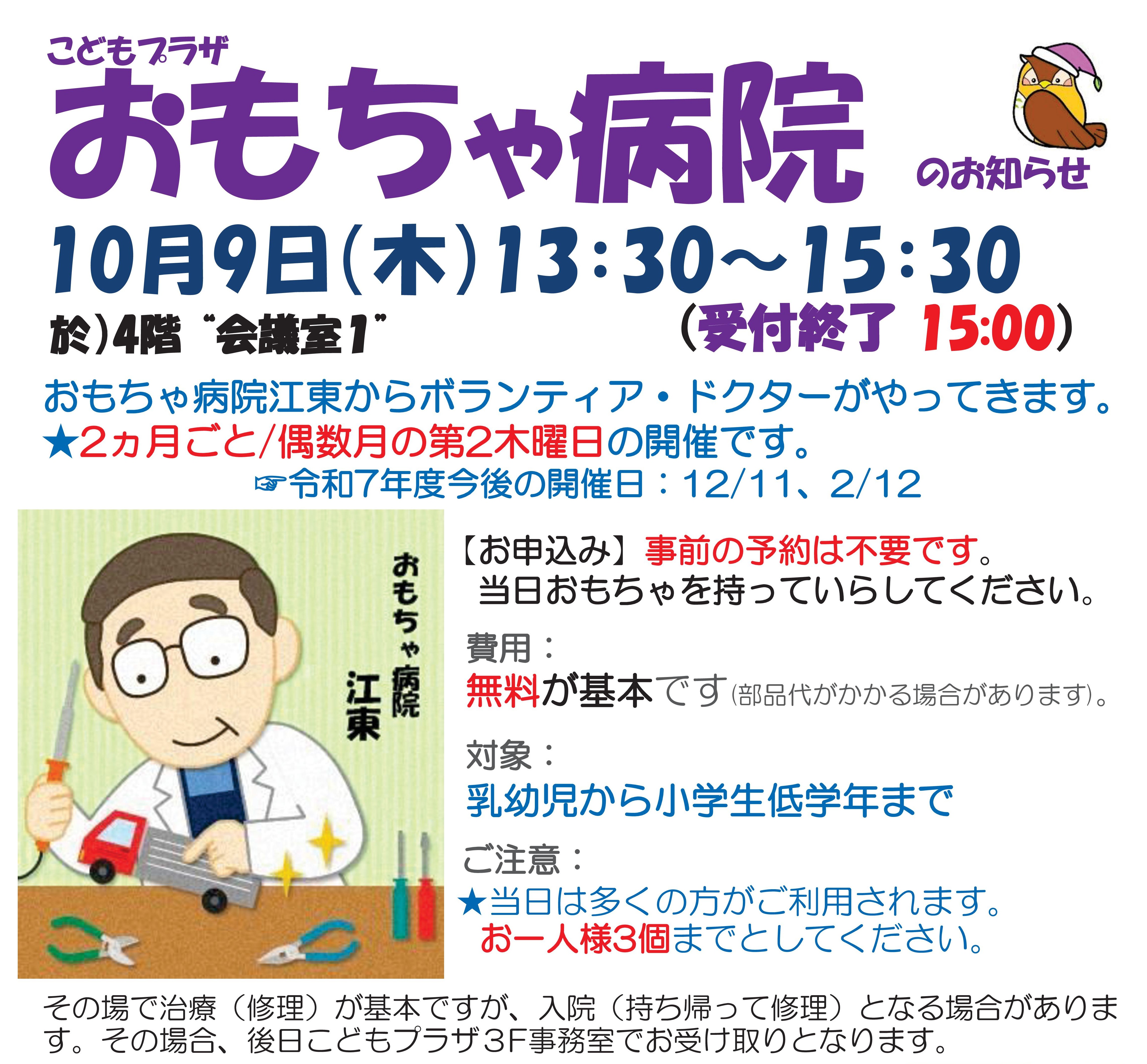 おうちに、動かなくなったり故障してしまったお気に入りのおもちゃはありませんか? おもちゃ箱の中で眠っている宝物を、おもちゃ病院のドクターによみがえらせてもらいましょう。 【日時】 10月9日(木曜日)13時半から15時半(受付終了 15時) 【会場】 江東区こどもプラザ 4階 会議室1 【対象】 乳幼児から小学校低学年 【申込】 事前の予約は不要です。直接会場へお越しください。 【費用】基本は無料ですが、部品代がかかる場合があります。 【注意】★当日は多くの方がご利用されます。お一人様3個 までとしてください。 その場で治療(修理)が基本ですが、入院(持ち帰って修理)となる場合があります。 その場合は後日、こどもプラザ3階事務室で退院(お受け取り)となります。 【以下のおもちゃは治療(修理)できません】 メーカー保証期間中の品(手を加えると保証が失効します) 安全性に問題があるもの(球を発射する鉄砲、ドローン、ヘリコプターなど) 希少価値のあるアンティークな人形やおもちゃ類(手を加えると市場価値が下がります) ディスプレイを備えたゲーム機 直接AC電源に接続するおもちゃ 浮き輪・ベビープール 充電池の交換・充電回路の修理 ※転売目的や業者の方のご依頼はお断りいたします。