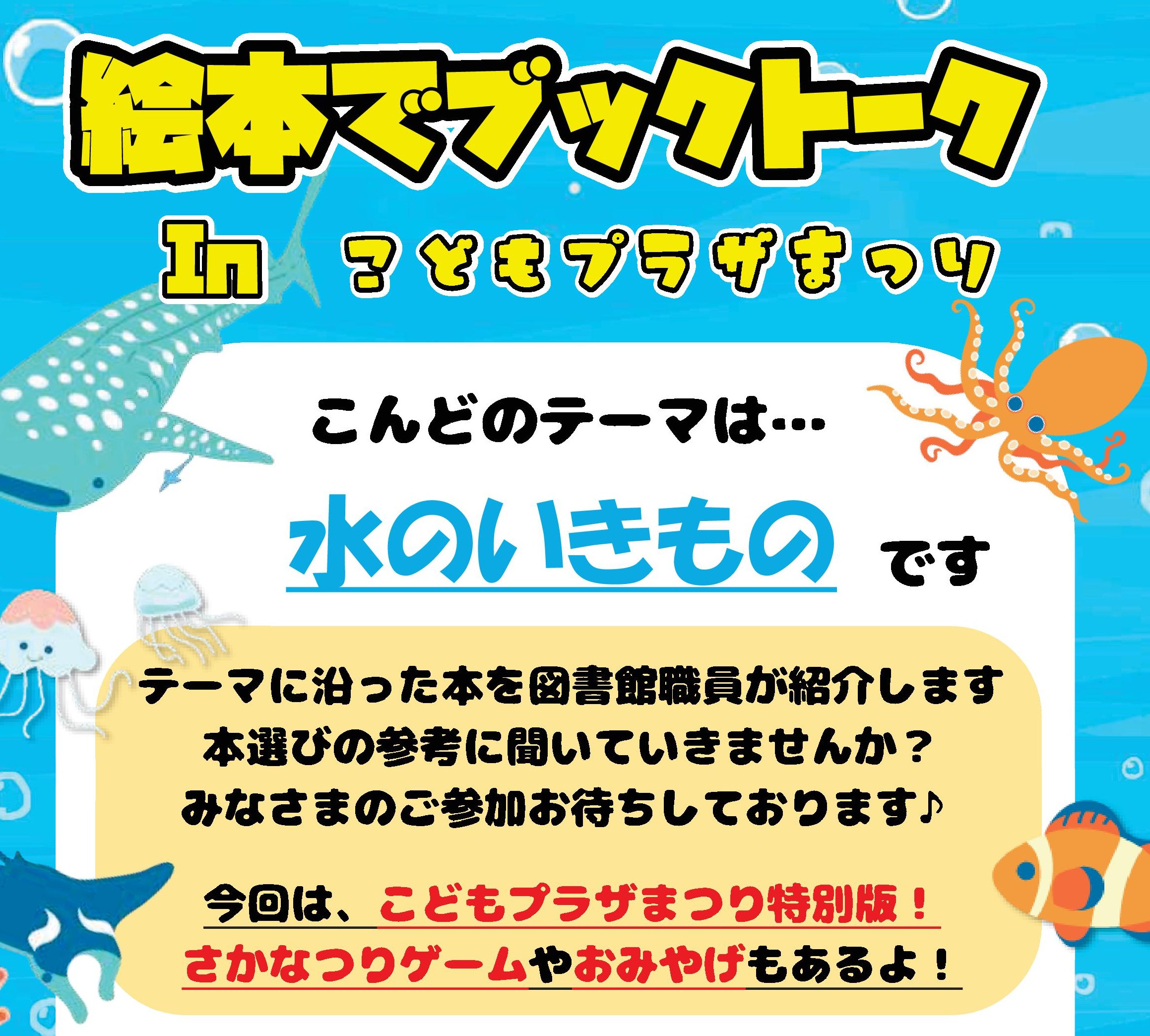 今回のブックトークは、こどもプラザまつり特別版です! テーマは、「水のいきもの」。テーマに沿った本を図書館職員が紹介します。 こどもプラザまつり特別版の今回は、さかなつりゲームやおみやげもあります♪ みなさんのご参加をお待ちしております!! 日時:2025年10月13日(月・祝) 1回目:11時30分~12時 2回目:14時~14時30分 場所:こどもプラザ図書館 2階おはなしのへや ★申し込みは不要です。時間になったら、おはなしのへやに来てください。