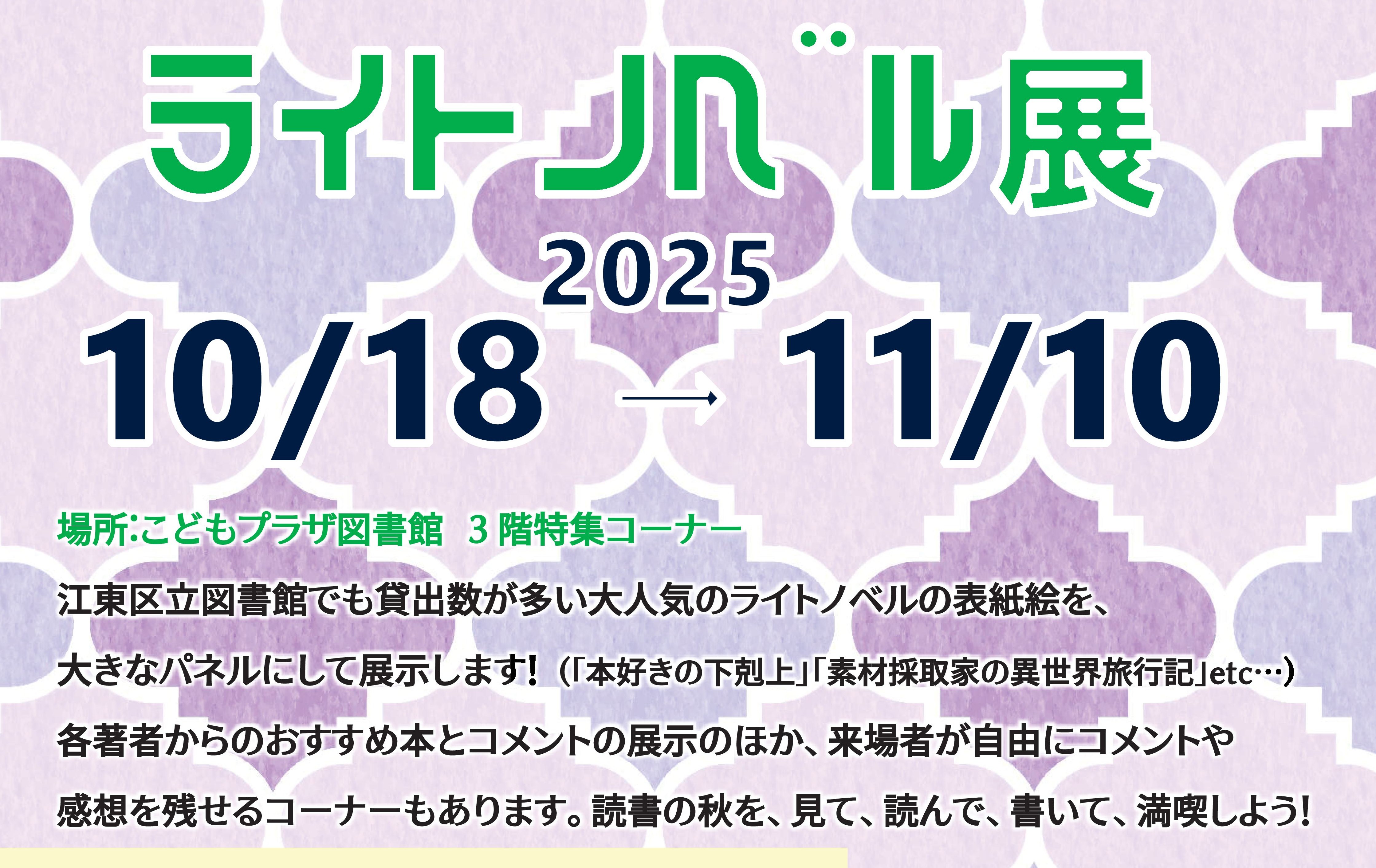 江東区立図書館でも貸出数が多い大人気のライトノベルの表紙を、大きなパネルにして展示します! (「本好きの下剋上」「素材採取家の異世界旅行記」etc…) 各著者からのおすすめ本とコメントの展示のほか、来場者が自由にコメントや感想を残せるコーナーもあります。 読書の秋を、見て、読んで、書いて、満喫しよう! 【日時】 10月18日(土曜日)から11月10日(月曜日) 【会場】 江東区立こどもプラザ図書館 3階 特集コーナー