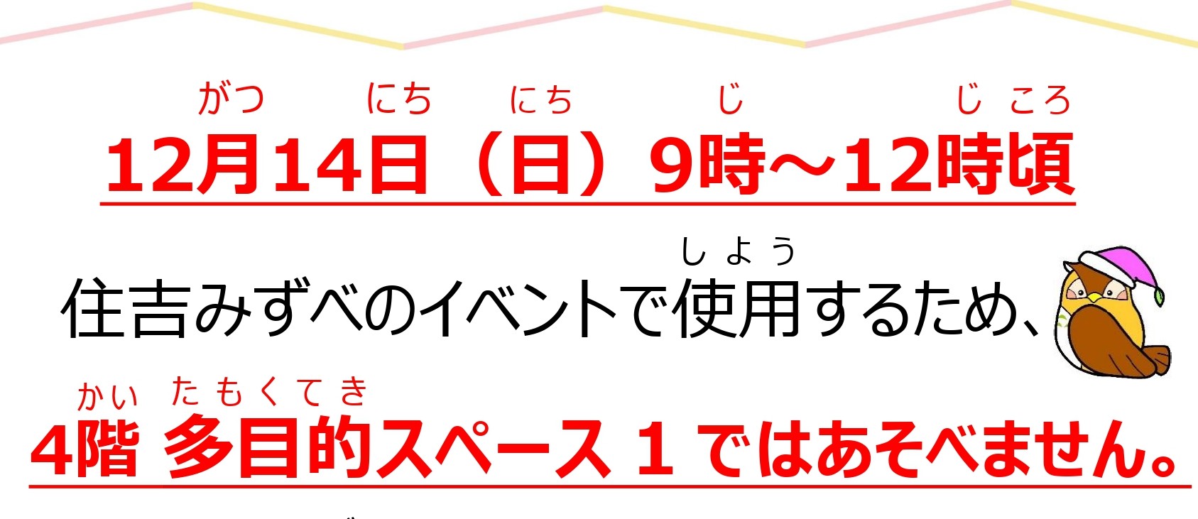 2025.11.17 こどもプラザ 12/14(日)多目的スペース1の利用について いつも、こどもプラザをご利用いただきありがとうございます。 12/14(日)9時~12時頃まで、住吉みずべのイベントで使用するため 多目的スペース1は使用できません。 その時間帯は、他の場所で遊んでください。よろしくお願いいたします。 詳しくはこちら 前の記事へ 一覧へ戻る