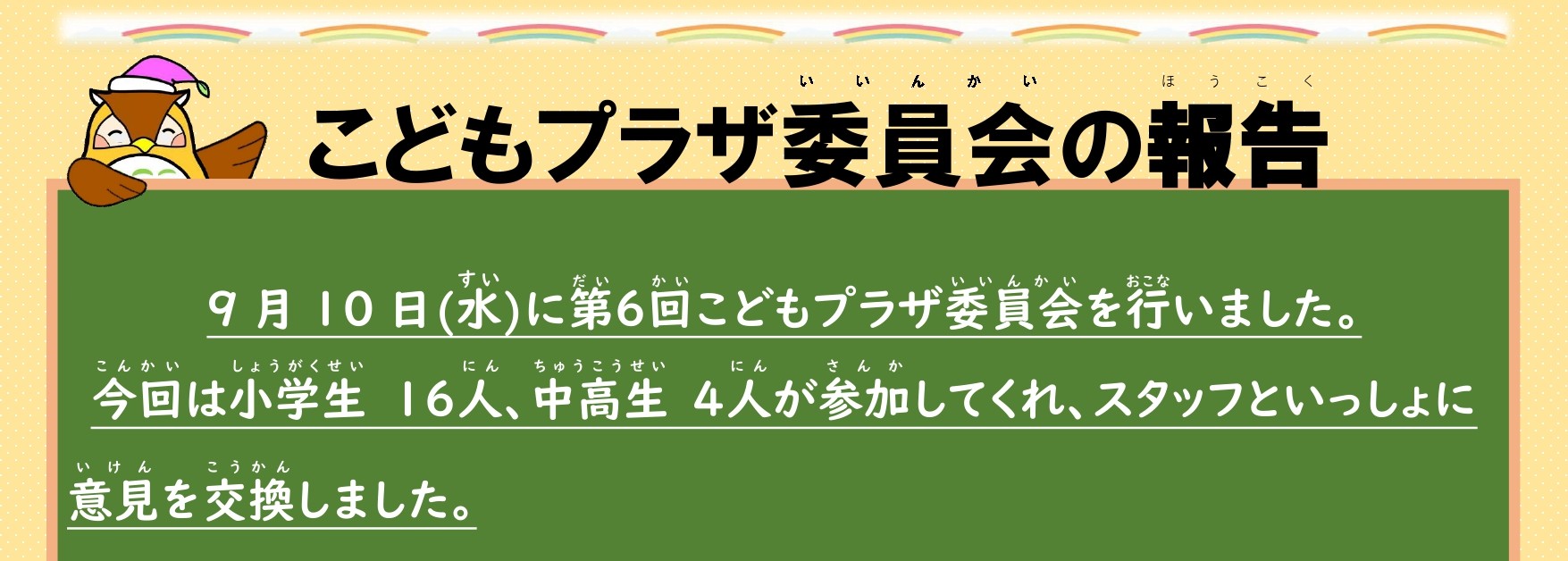 2025.11.19 こどもプラザ こどもプラザ実行委員会の報告 9/10(水)こどもプラザ実行委員会を行ないました。 スタッフと一緒に意見交換しました。 次回は11/26(水)ぜひ参加して下さい。 詳しくはこちら 前の記事へ 一覧へ戻る