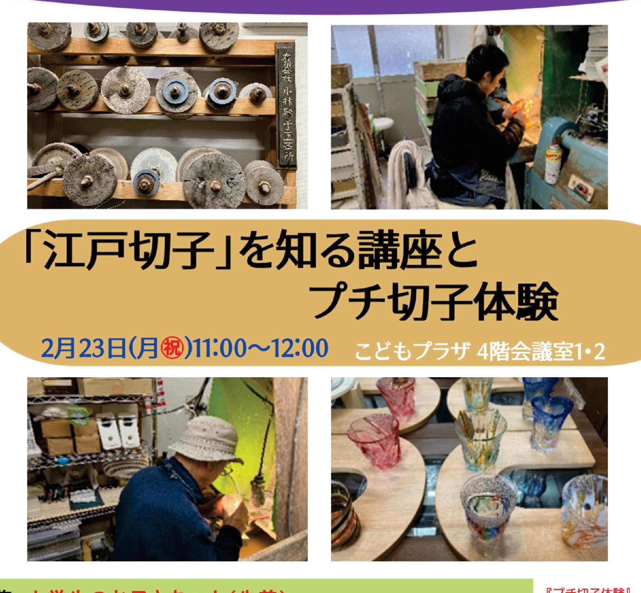 こどもプラザ周辺の江東ブランドに認定されている企業から、猿江二丁目で江戸切子の製造を営む店舗までを写真等でご紹介する展示会を開催します。