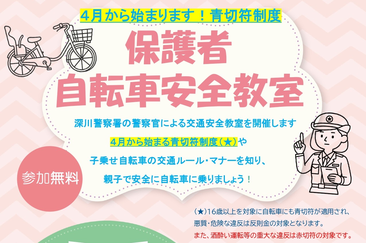 2026.02.19 こどもプラザ 「保護者 自転車安全教室」開催のお知らせ 深川警察署の警察官による交通安全教室を開催します。 日時 3月10日(火)10:30~11:30 場所 こどもプラザ 4階 多目的スペース1 定員 20組(先着順) 対象 子乗せ自転車を利用中もしくは今後利用予定の親子 申し込み 2/25(日)9:00~ ポータルサイトからの申し込みとなります 申し込みはこちら 問い合わせ先 江東区こどもプラザ 03-5600-3880 詳しくはこちら 次の記事へ 一覧へ戻る