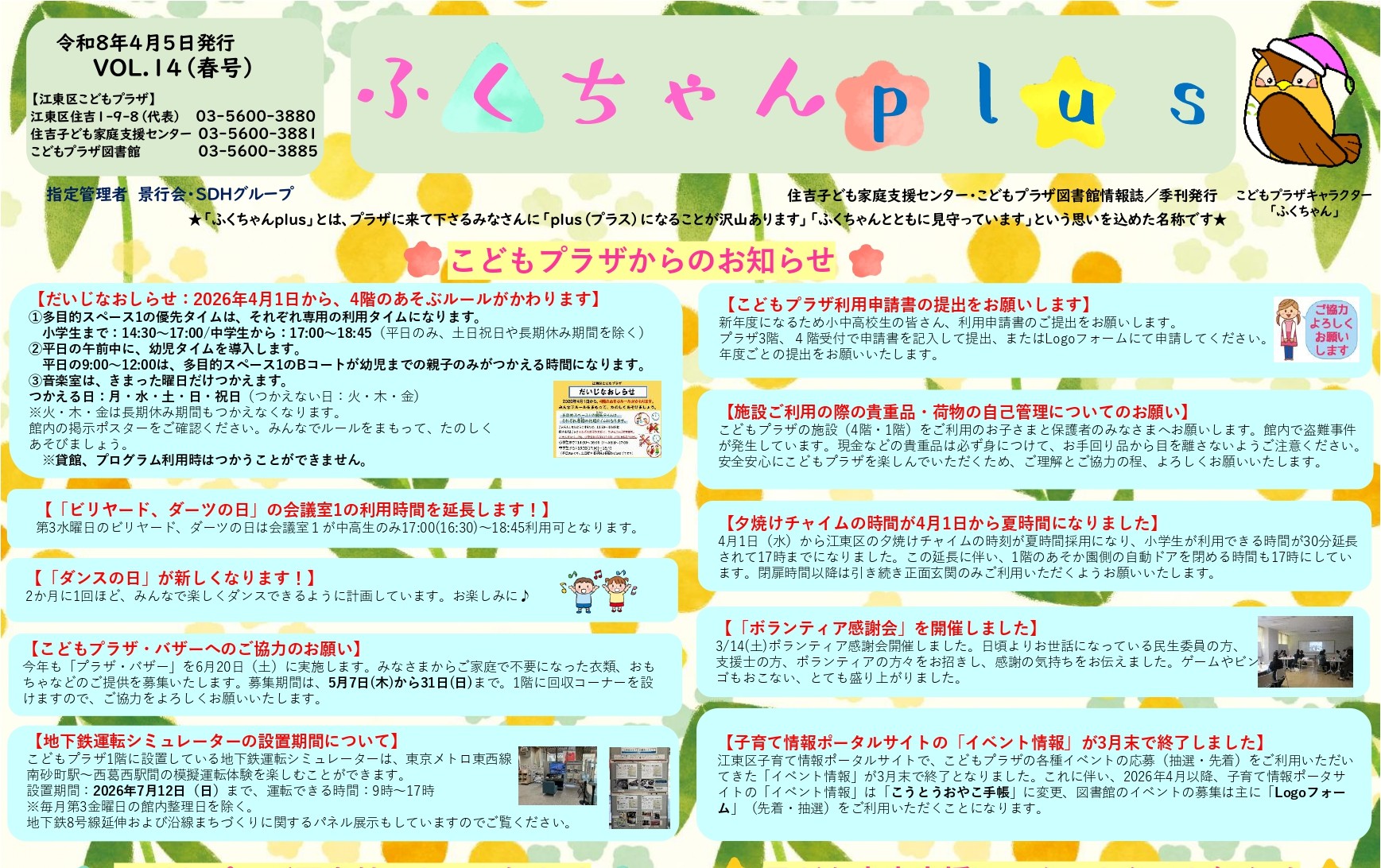 2026.04.05 こどもプラザ ふくちゃんplus2026年度春号が完成しました! いつも、こどもプラザをご利用いただきありがとうございます。 こどもプラザNews『ふくちゃんplus』春号が完成しました。 4月以降に開催予定の行事やプログラムのお知らせもたくさん載っています。 『ふくちゃんplus』春号は館内にも置いてあるので、ご自由にお持ちください。 詳しくはこちら 前の記事へ 一覧へ戻る