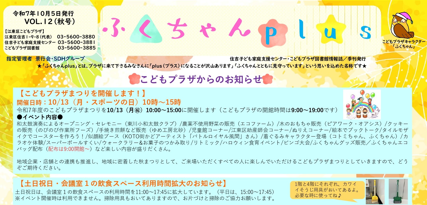 いつも、こどもプラザをご利用いただきありがとうございます。 こどもプラザNews『ふくちゃんplus』秋号が完成しました。 10月以降に開催予定の行事やプログラムのお知らせもたくさん載っています。 『ふくちゃんplus』秋号は館内にも置いてあるので、ご自由にお持ちください。